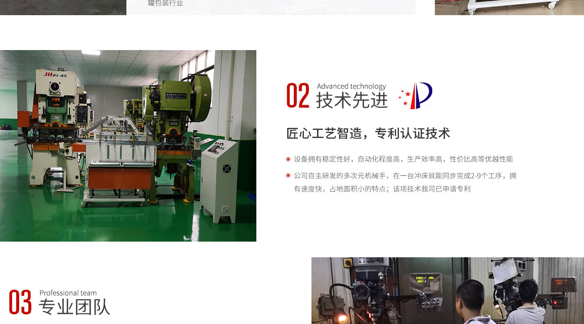 罐身自動扣骨機(jī)生產(chǎn):茶葉罐/酒罐/化妝品罐/內(nèi)衣罐等等. 其中多次元機(jī)械手專為兩片盒的生產(chǎn)和三片罐的蓋、底、蓋圈、拍底蓋等的生產(chǎn)而設(shè)計,...